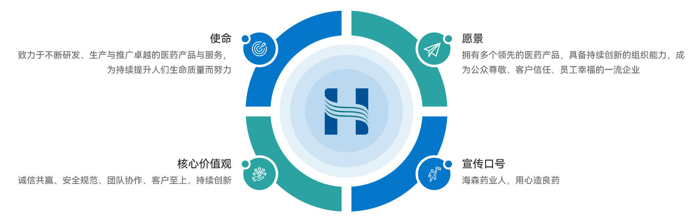 海森藥業(yè)遵循“誠信共贏、安全規(guī)范、團隊協(xié)作、客戶至上、持續(xù)創(chuàng)新”的核心價值觀,建立了高標準的質(zhì)量管理體系、環(huán)境管理體系、職業(yè)健康安全管理體系,為企業(yè)健康發(fā)展保駕護航。以“擁有多個領(lǐng)先的醫(yī)藥產(chǎn)品,具備持續(xù)創(chuàng)新的組織能力,成為公眾尊敬、客戶信任、員工幸福的一流企業(yè)”的發(fā)展愿景,努力踐行“致力于不斷研發(fā)、生產(chǎn)與推廣卓越的醫(yī)藥產(chǎn)品與服務(wù),為持續(xù)提升人們生命質(zhì)量而努力”的使命。