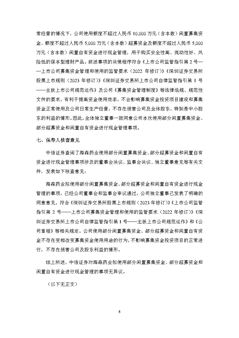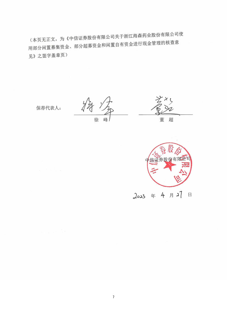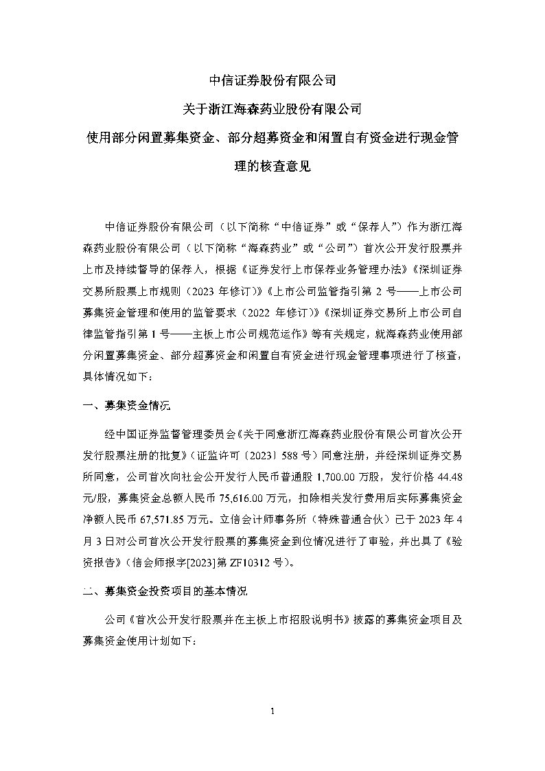 中信證券股份有限公司關(guān)于浙江海森藥業(yè)股份有限公司使用部分閑置募集資金、部分超募資金和閑置自有資金進(jìn)行現(xiàn)金管理的核查意見